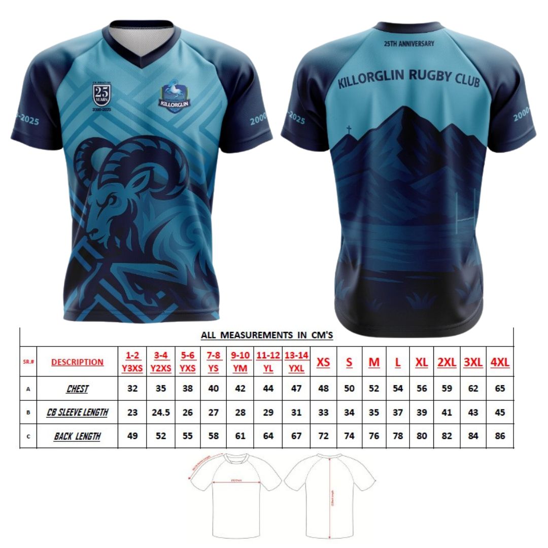 Featuring a powerful mountain goat graphic—symbolizing resilience and strength, the spirit of Killorglin RFC. The back of the jersey features the MacGillycuddy Reeks which over look our home grounds in Ballymalis. The club crest proudly sits on the chest alongside a bespoke 25th Anniversary badge, with "2000–2025" subtly displayed on the sleeves to mark the milestone.